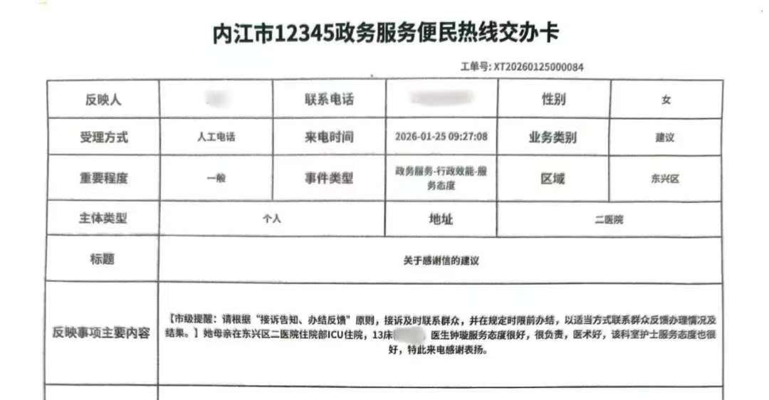 近日,内江市12345政务服务便民热线接到了一通满怀感激的来电。市民王女士特意致电,恳切表扬内江市第二人民医院重症医学科钟璇医生及全体医护人员。这通电话的背后,是一个关于生命奇迹、医者仁心与家庭温暖的动人故事。