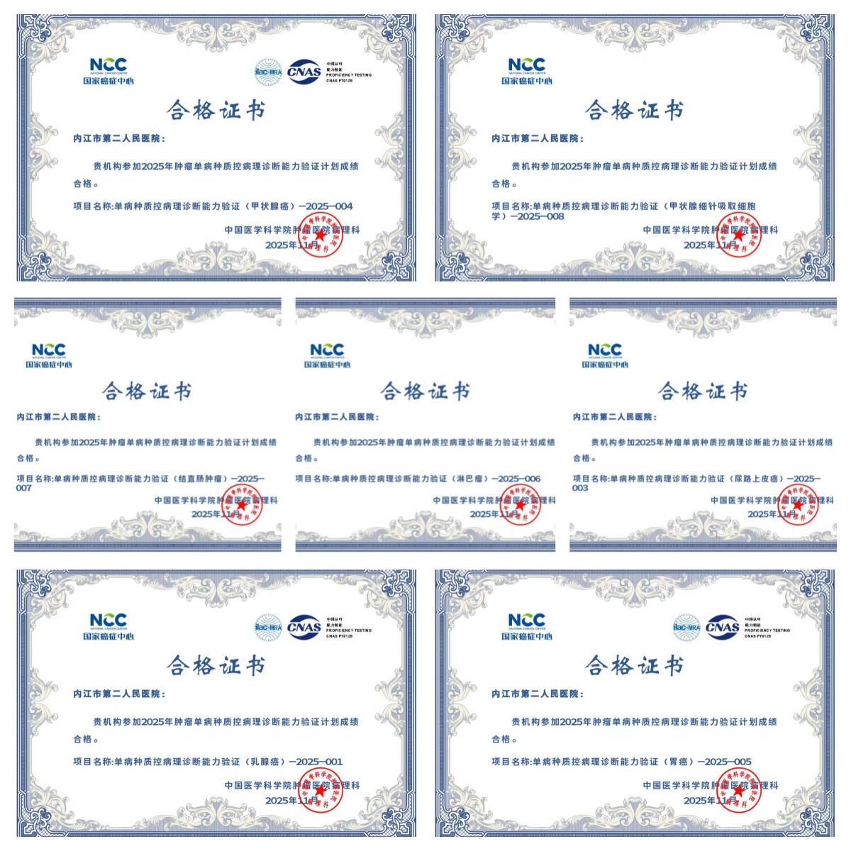 近日,国家癌症中心正式公布了“2025年度肿瘤单病种质控病理诊断能力验证计划”考核结果,我院病理科以优异的成绩通过项目能力验证。至此,我院病理科已连续4年通过国家癌症中心“肿瘤单病种质控病理诊断能力验证计划”项目,标志着其在肺癌、乳腺癌、前列腺癌、结直肠癌、胃癌、尿路上皮癌、甲状腺癌、淋巴瘤等肿瘤的病理诊断能力已达到国内同质化水平,获得了国家级权威认可,能够为内江地区肿瘤患者的精准诊疗提供强有力的保障。