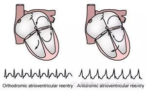 拥有这条“小路”的心脏结构状态,就称为预激综合征。值得注意的是,有这条“小路”的人不一定都会有症状,这种单纯有心电图表现而无症状的情况,仅称为“心室预激”。当“短路”引发“环流”,这条“小路”的存在,埋下了一个巨大的隐患——它可能构成一个“环形运动电路”,从而引发极其快速的心律失常,主要有两种类型: