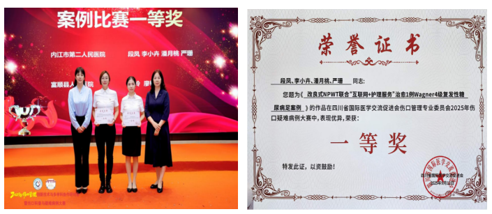 技术成效已获权威验证,2025年,我院伤口专科护士凭借《改良式NPWT联合“互联网+护理服务”治愈1例Wagner4级复发性糖尿病足》案例,从全省86份作品中脱颖而出,斩获四川省国际医学交流促进会伤口疑难病例大赛一等奖。该案例成功为一名面临截肢风险的重症患者保住肢体,用实战彰显技术实力,也收获了患者家属的高度认可与锦旗致谢。
