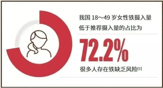 中国:育龄女性(20~29岁)和孕期女性的铁缺乏(缺铁性贫血+铁减少)的比例分别为49.5%和61.7%,约50%的年轻女性可能存在铁摄入不足的风险。