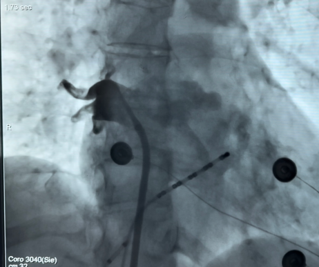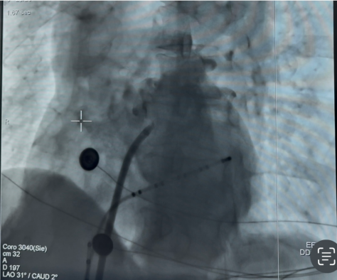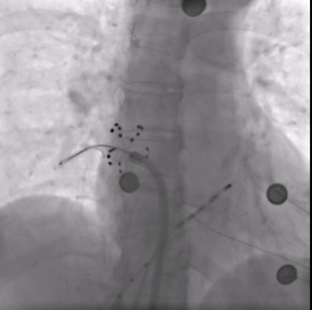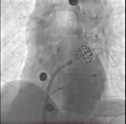 1.通路建立:经右侧股静脉穿刺置入冠状窦电极及鞘管,DSA引导下完成房间隔穿刺,建立左心房器械通路;