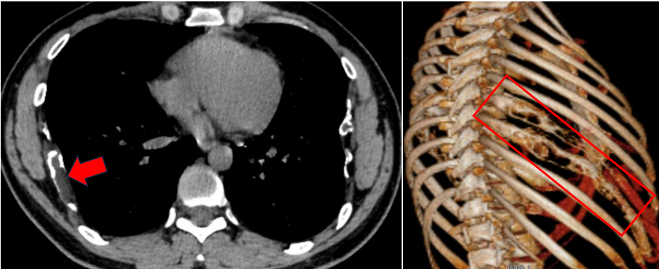 近期,我院收治1例中年男性患者,主因“发现双侧肋骨肿物伴右侧胸部疼痛半年”入住胸外科。 胸部CT检查提示:右侧第7、8及左侧第6、7肋骨骨质膨胀性破坏,形态不规则,考虑骨纤维结构不良可能。结合患者病情及病灶范围,考虑患者当前症状以右侧胸痛不适为主,影像学表现虽考虑良性病变,但病灶存在进一步进展风险,遂优先行胸腔镜下右侧胸腔第7、8肋骨肿物切除术,手术顺利,完整切除病变肋骨及相邻组织。术后病理:右侧第7/8肋纤维结构不良。术后恢复良好,顺利出院。