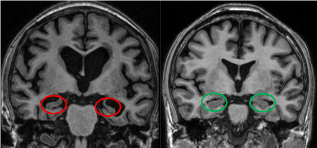 图2:头颅冠状位MRI图像(左图为56岁老年痴呆症患者,MTA4分,红色圆圈标注为明显萎缩的海马结构;右图为60岁健康成人,MTA0分,绿色圆圈内为正常海马结构)