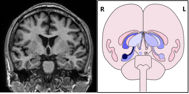 图3:65岁患者,因认知功能降低,常规头颅MRI图像(左图)MTA评分0分,精神影像(右图)后处理显示其右侧海马萎缩超过10%,后证实为MCI(轻度认知损害)