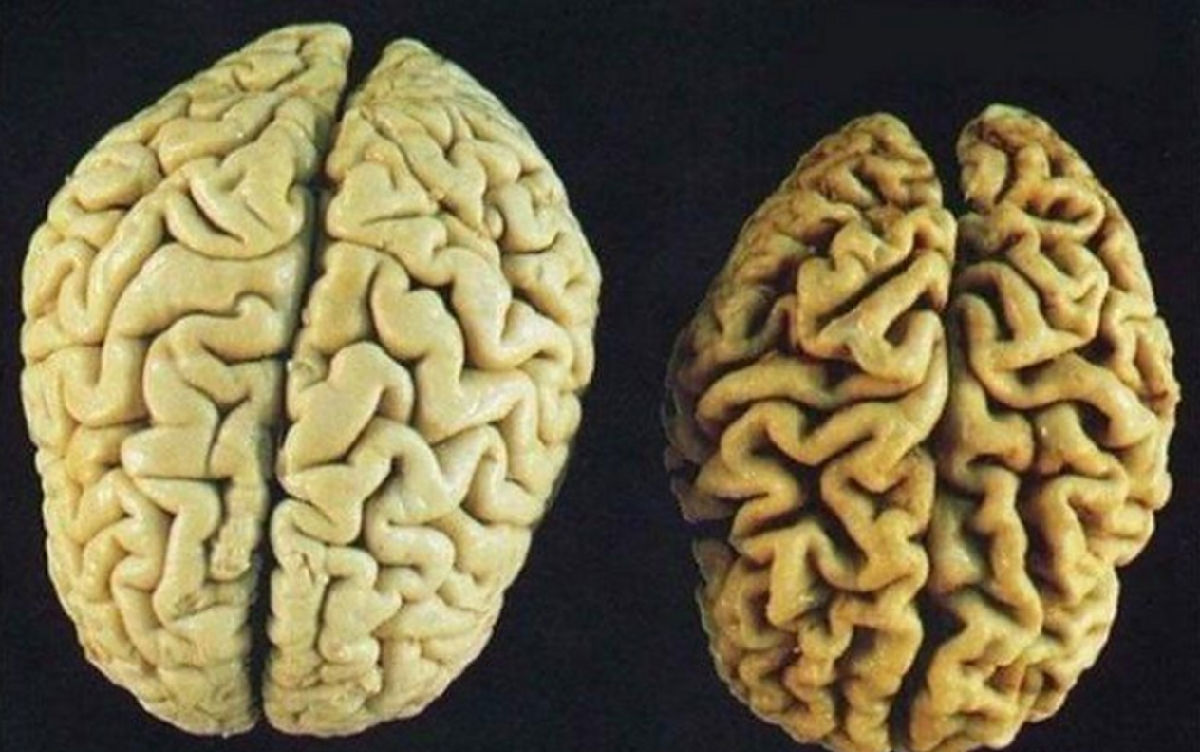 图1:正常成人30岁(左)与80岁(右)的大脑标本