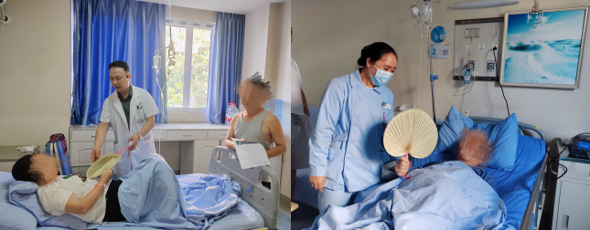 灭蚊消暑,双管齐下。泌尿外科病房内,监护设备规律作响,患者们却因暑热心烦意乱。科主任及护士长带领团队轻盈穿行于病床间,向患者分发一把把蒲扇,“张伯,给您添个‘清凉助手’!扇子轻,您用着不费劲。”清风有形,仁心无价。一把蒲扇,其力甚微,摇不动三伏的烈阳。这把蒲扇虽小,却藏着“换位思考”的贴心,不用考虑电源,不怕风吹得太猛,患者自己能摇,家属也能帮忙,轻轻一扇,不仅带来了清凉,更让患者感受到被理解的暖心。