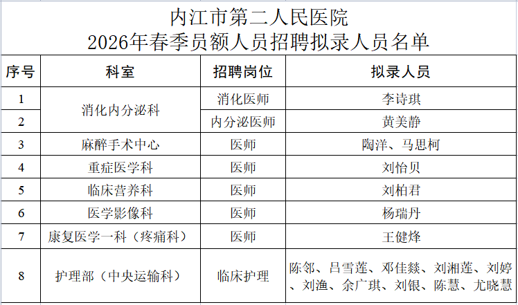 根据《内江市第二人民医院2026年春季员额人员招聘公告》规定,经面向社会发布公告、网上报名、资格审查、专业考试、面试等程序,现确定以下人员为本次招聘拟录用人员,予以公示。